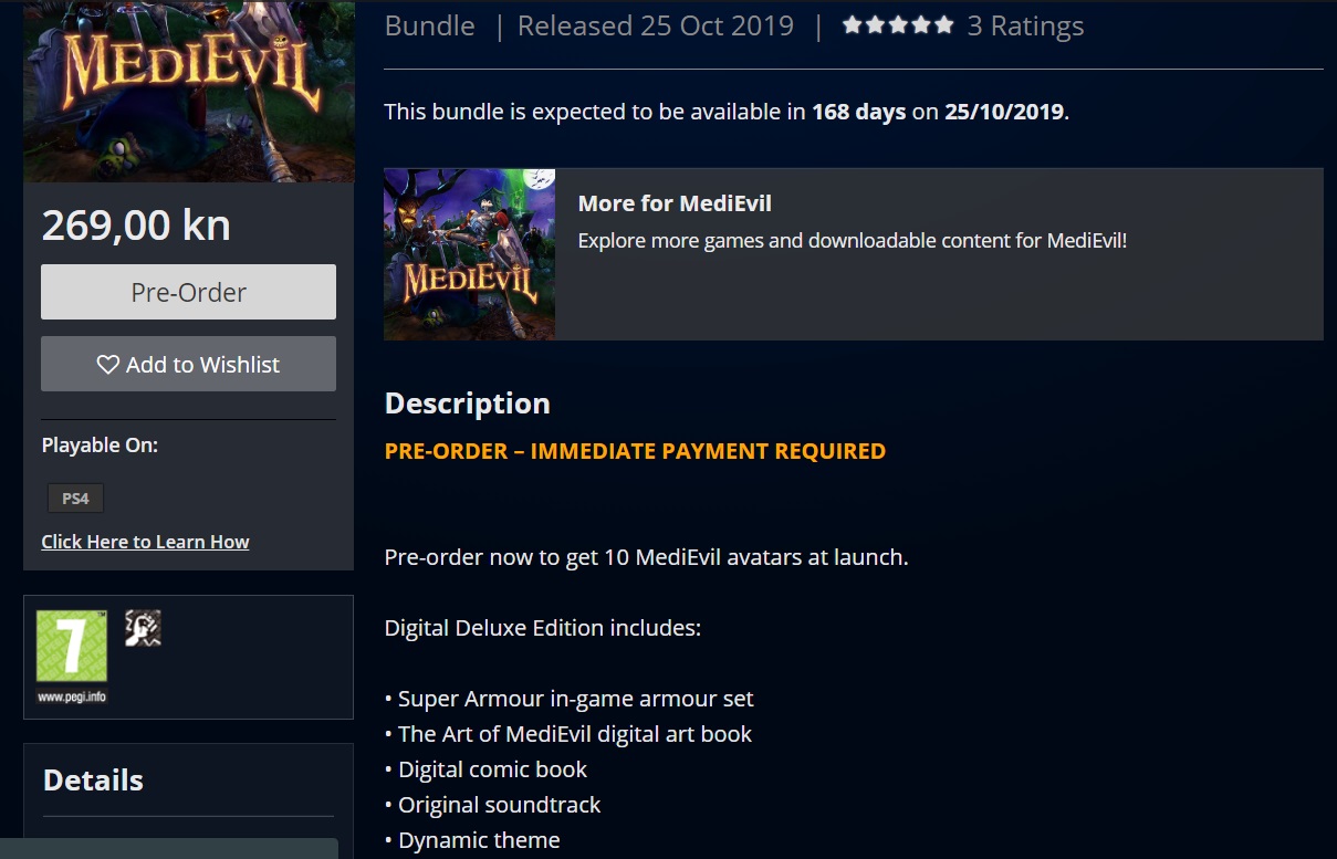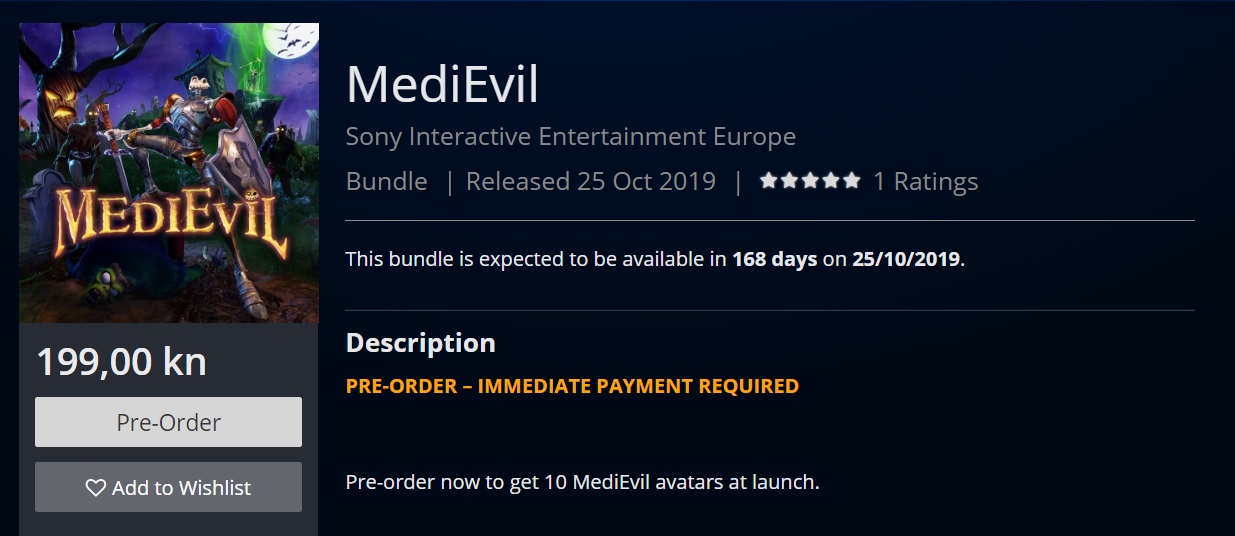 Pa nismo se tome nadali, ali ovo je svakako odlična vijest. Surfajući jutros bespućima PlayStation Storea, gledam sve te lijepe igre za koje nemam novca i koje ne mogu kupiti i odjednom ugledam MediEvil pre-order i vidim cijenu. Onda protrljam oči da se uvjerim da ne sanjam i vidim da MediEvil zaista košta samo 199kn. Postoji i Deluxe izdanje koje košta 269kn.