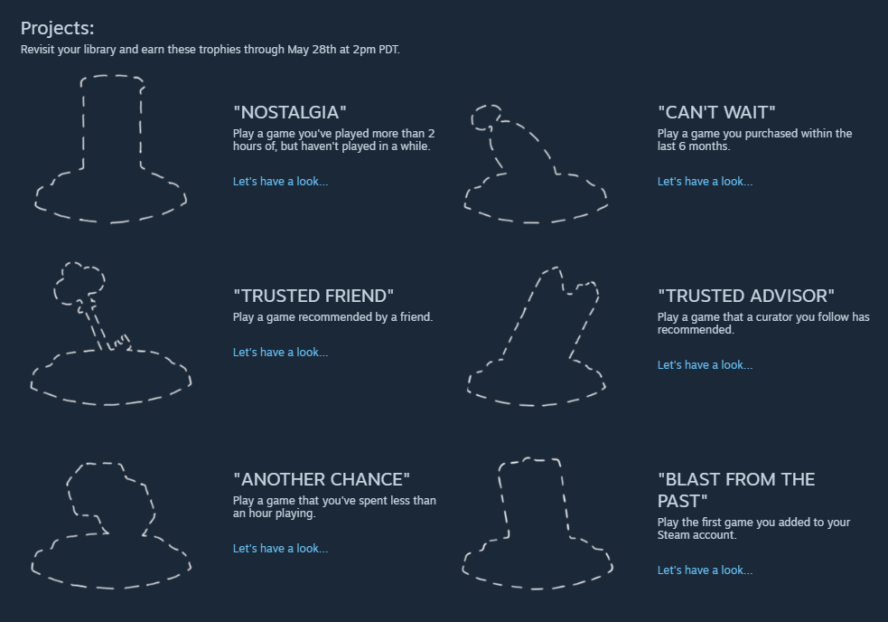 Što se tiče projekata imamo primjerice zadatak odigrati neku igru iz naše biblioteke koju smo igrali više od 2 sata, ali ju nismo pokrenuli već neko vrijeme ili primjerice zaigrati neku igru koju smo kupili u zadnjih 6 mjeseci. Cijelu listu projekata možete pogledati u sljedećoj slici.